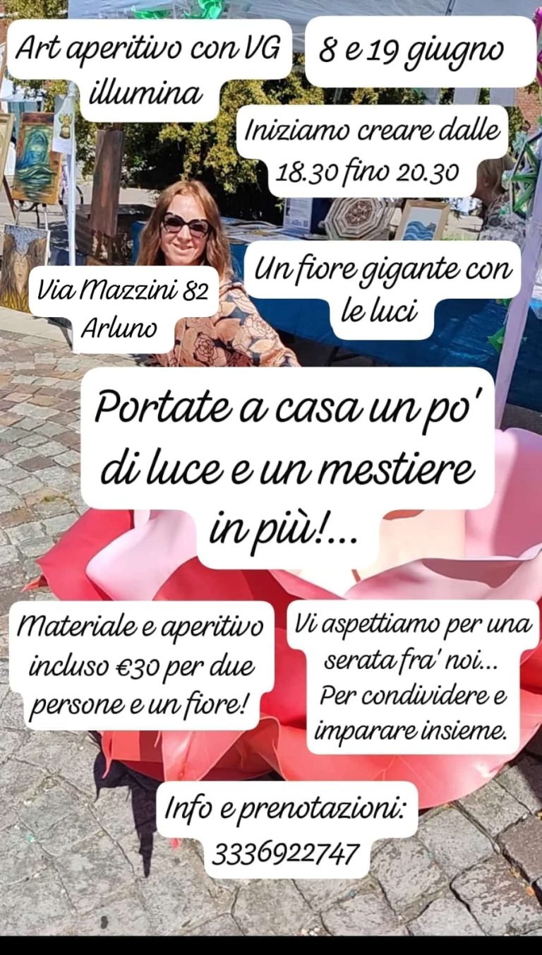 Riguardo arte-aperitivo che parte dai 13 anni in su … fino ai 100! Il nostro scopo è riunire madre e figlia o nonna e nipote o anche donne di tutte le età … passare una serata dedicata all’arte di ogni genere … In questo caso faremo i lavori con materiali vari, come la gomma per le lampade, foam e fogli secchi per le composizioni floreali; utilizzeremo anche tessuti reciclati dai vestiti che non usiamo più… e faremo creazioni come quadri usando diverse tecniche.